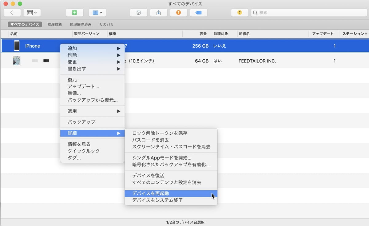 また、Apple Configurator2 からも再起動コマンドを送ることができます。