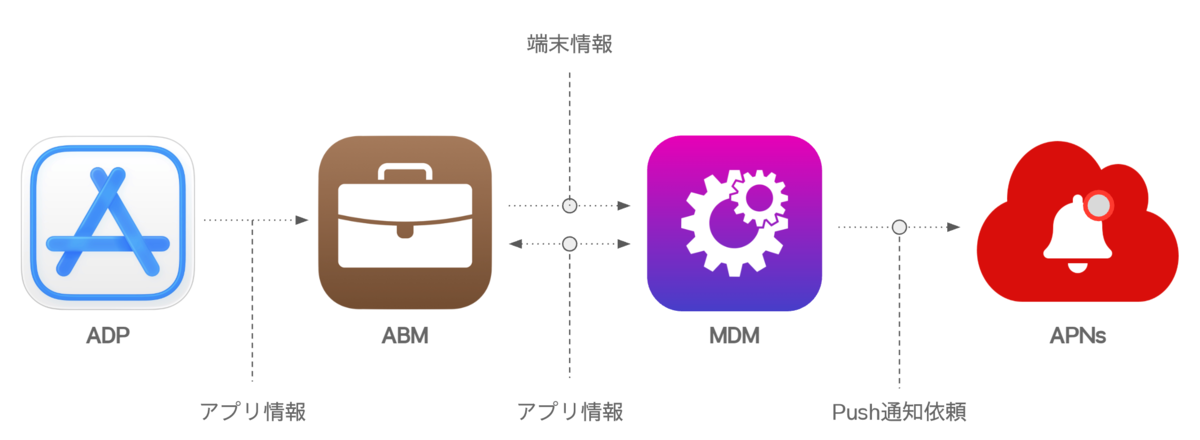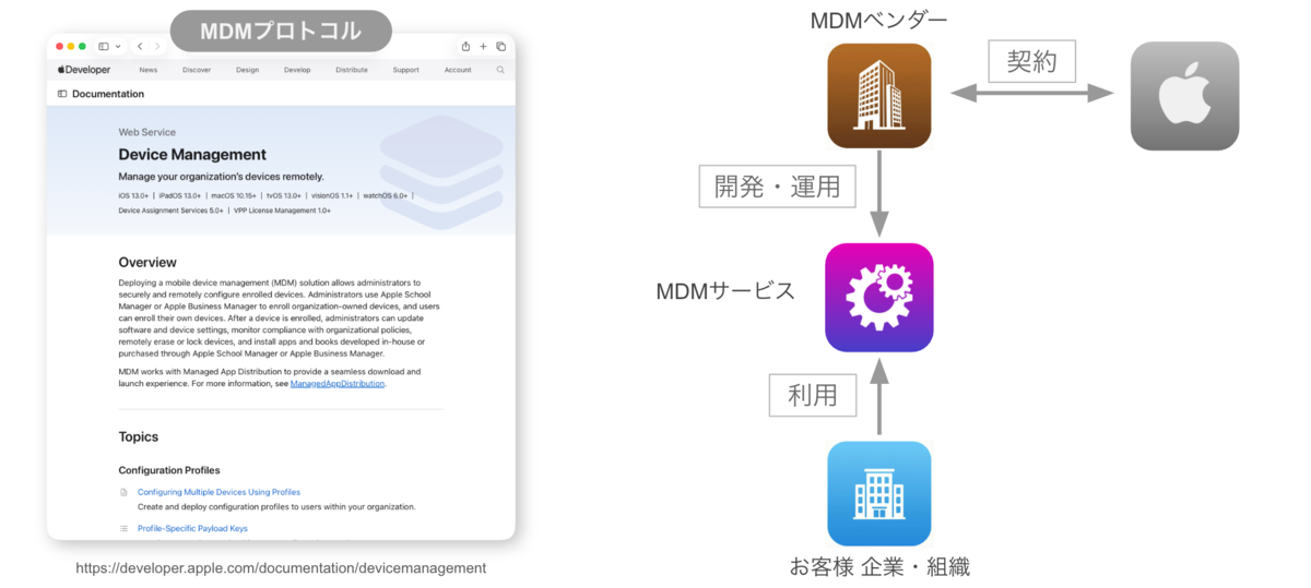 ここで重要なポイントは、MDMはサードベンダーの領域だったということです。AppleはMDMプロトコルを規定するのみで、それに準拠したMDMサービスをMDMベンダーが開発して法人に提供するという構図が基本でした。
