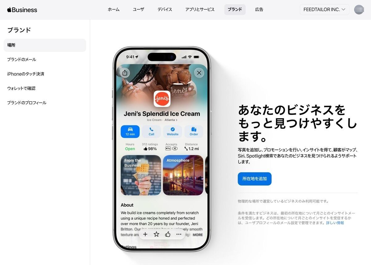 いわゆる情シスのような管理部門の方からすると、正直、冒頭で述べたような余計な(?)マーケティング的機能がノイズに見えなくもありません。Apple Business Connect というサービスが統合された結果ですが、例えば「ブランド」なるページ。