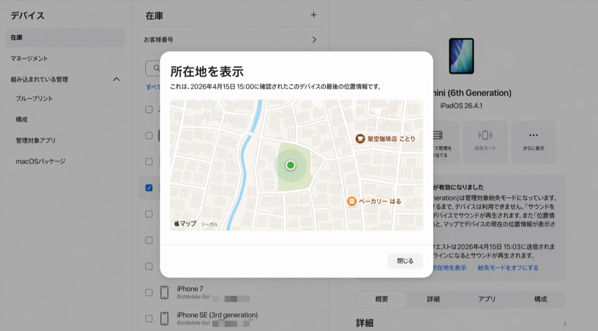 HOME画面に移動することもできませんし、アプリを起動することもできません。この画面だけ。さらに紛失モード中は、端末の現在位置を Apple Business 上で把握できます。