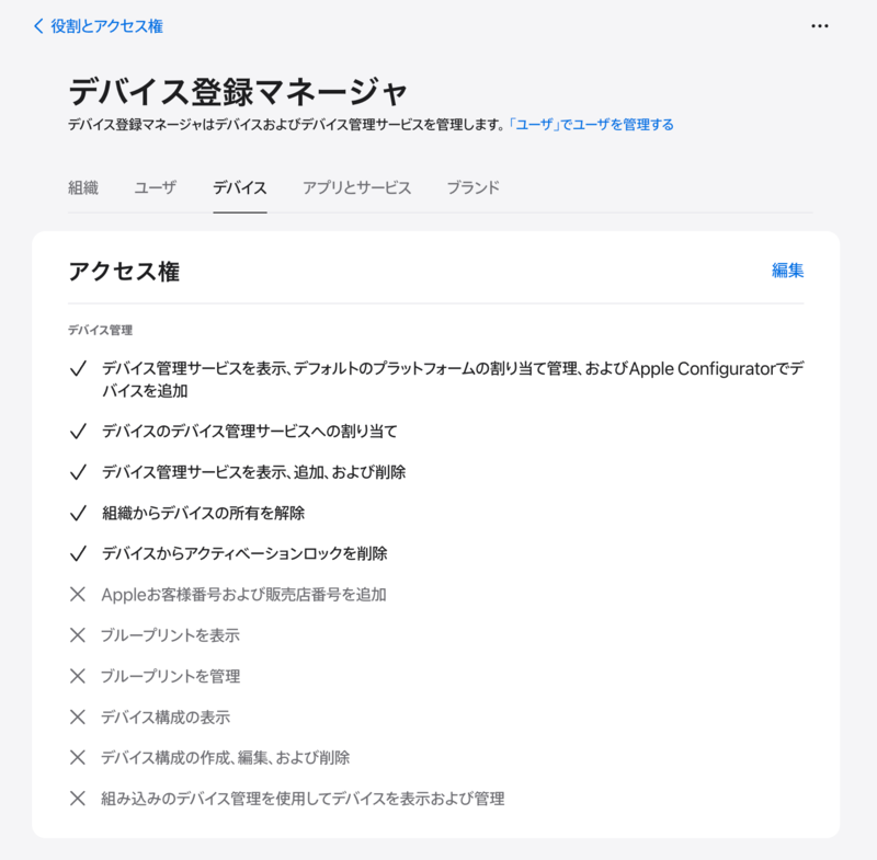 権限をある程度まとめた「役割」もプリセットで幾つか用意されています。ABM時代の「コンテンツマネージャ」「デバイス登録マネージャ」「ユーザマネージャ」という管理系の3つの「役割」も移行されています。