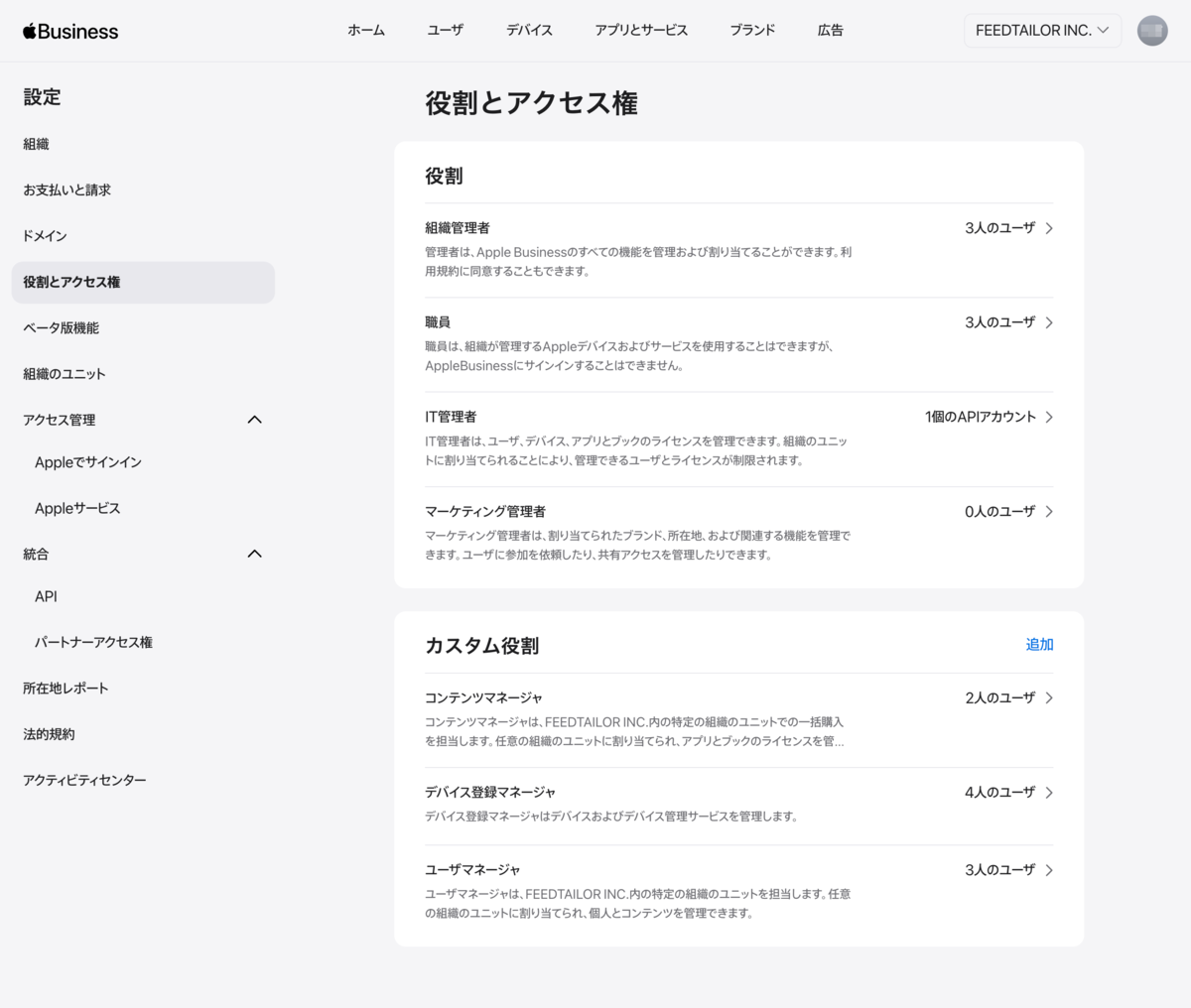 権限設定や「役割」をうまく使えば、Apple Business を、デバイス管理(MDM)の機能しか持たないサイトとして見せることも可能ですので、管理部門に優しい作りになっていると言えるでしょう。