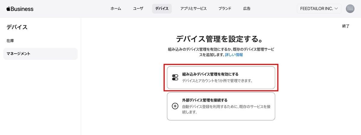 (Apple Business でのデバイス管理機能のことを「組み込みデバイス管理」と呼ぶ)